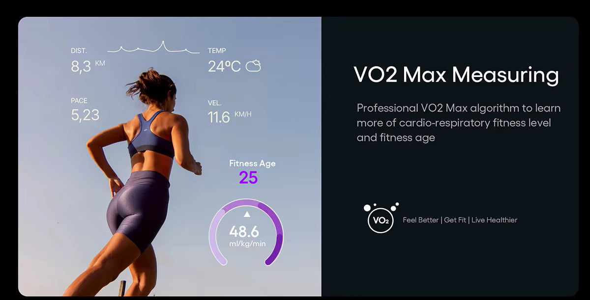 - Measures VO2 Max for cardiovascular fitness.